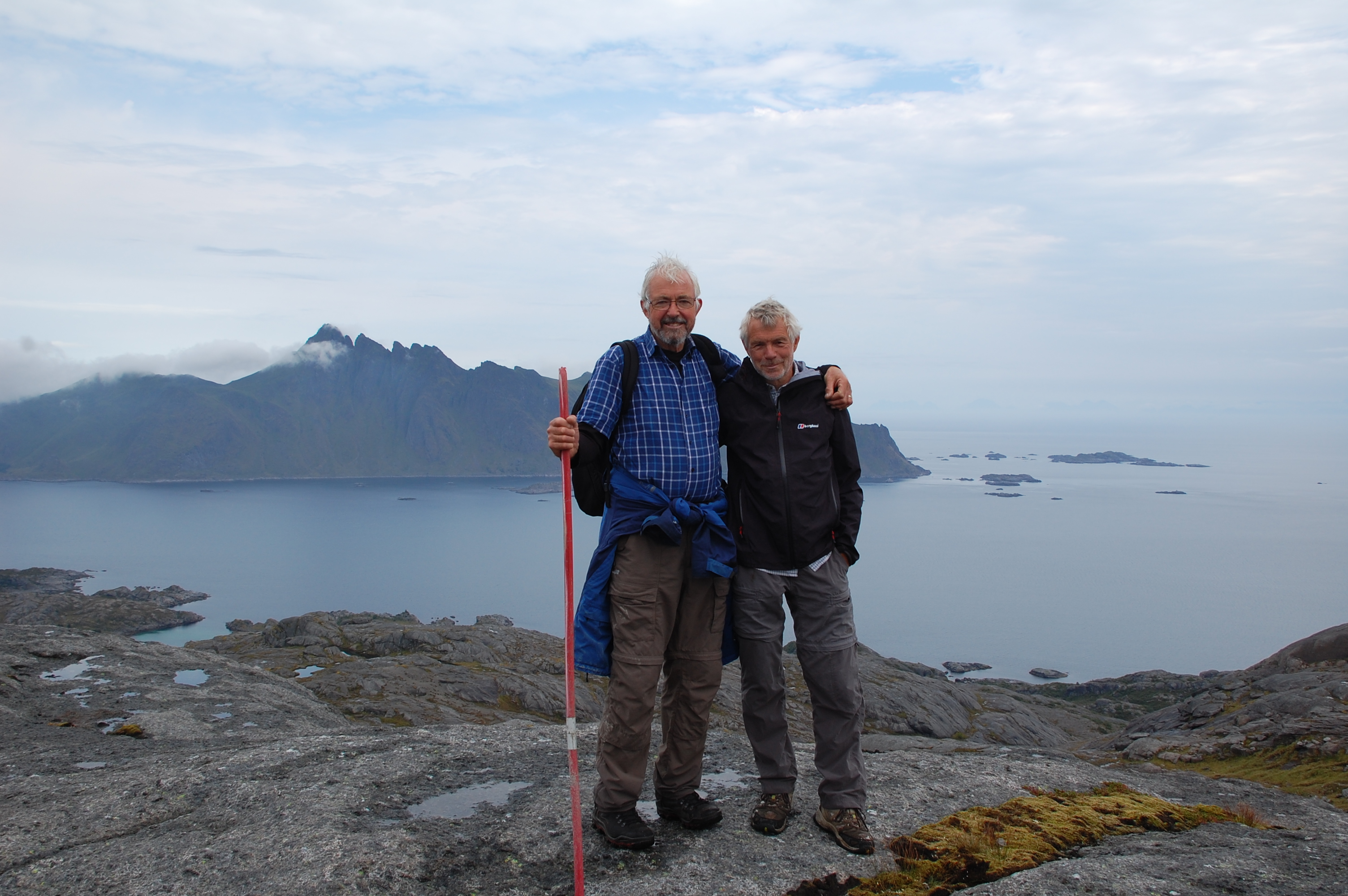 The weather is wet and misty next morning but forecast to clear and David has researched a walk on the rando-lofoten website downloading the map onto our i-pad. John starts a loaf of bread and we set off together with a picnic by mid morning. John finds some excellent walking staves (discarded snow poles?) by the roadside. We borrow them and replace on our return.