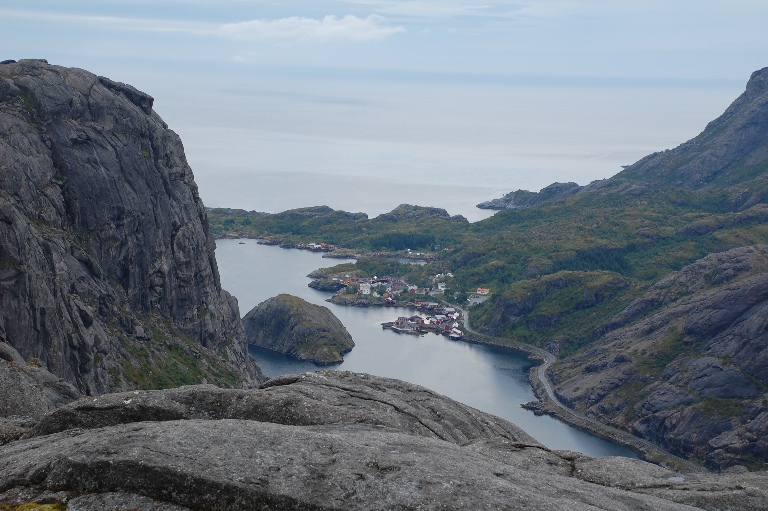 Climb through lovely woods and out onto bilberry covered rocky and mossy terrain. Gentle gradient and nothing too tricky and soon we reach the first summit with awesome views – Nusfjord village to South, Nappsstraumen to East and Flakstadpollen to North. Picnic here then return for a relaxing afternoon baking bread, writing the blog, reading and eating a delicious dinner.
