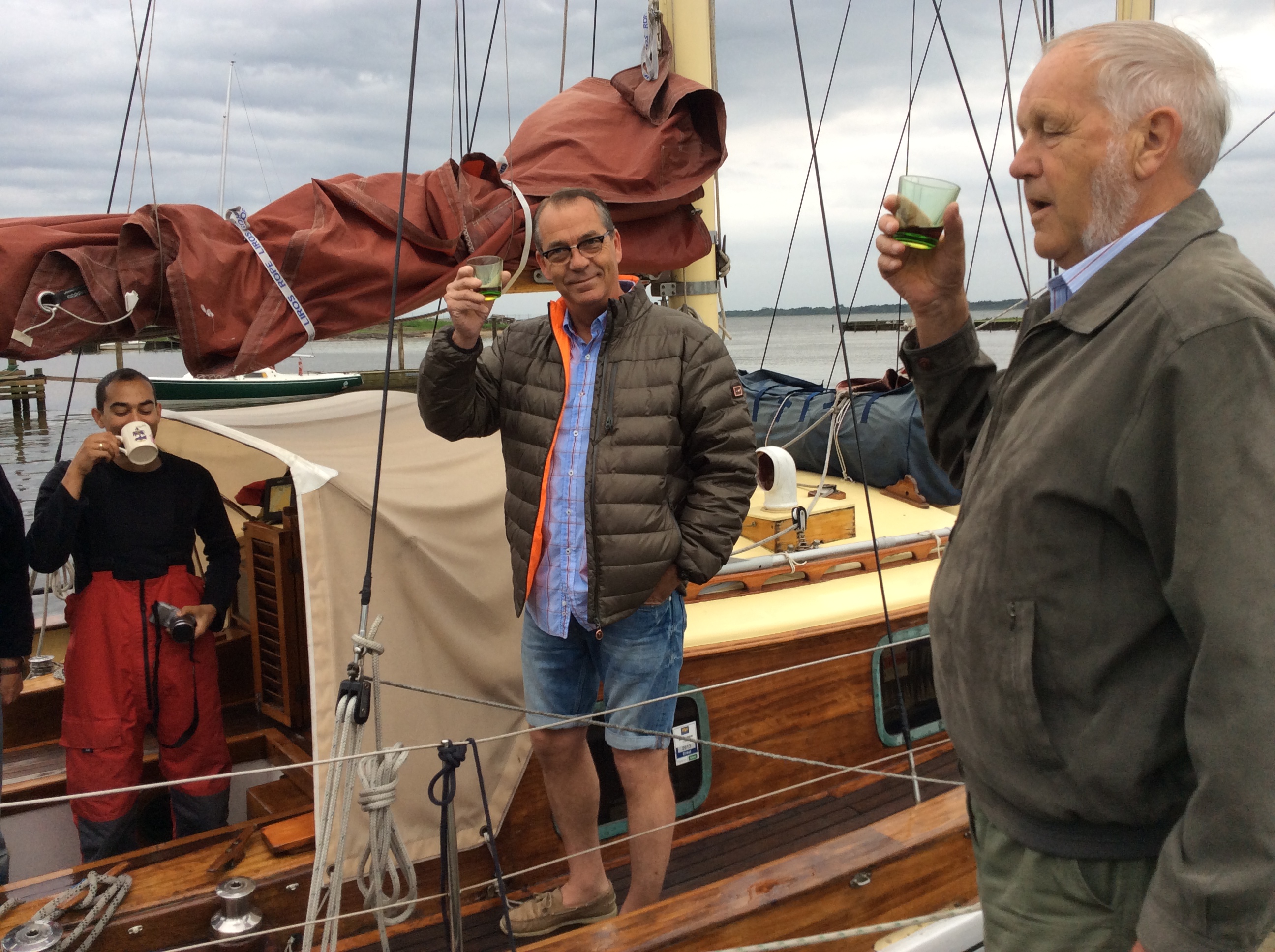 What a nice surprise to see Lars and Helle sailing out to meet us on the approach to Skive! And wonderful to see the ‘welcome home Aldarion and crew’ sign at our mooring place in the boatyard. Even better that Ole and Edward were there and that Helle and Lars had flags up, and champagne and cake waiting for us, at which point, Gunnar and Poula arrived to join the welcoming party. And they had cooked a nice meal for everyone at home, which we enjoyed with good wine and chat. What a great homecoming! We also managed to get the sails off dry, and packed off for small repairs to Birthe’s sewing shop. It’s a shock to stop, but also great to be back safely and with no major problems.