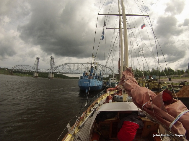 Sunday 6th July – Crew leaving in Arkhangelsk A gorgeous hot sunny day! Sergey helps to ensure that we get diesel and water, both of which are low! Karen and John shop. Sergey, Rory and Tia prepare to leave the boat. Suddenly it seems empty! We eat together in the evening- another BBQ. Vodka is becoming a habit! Sergey leave for the 9.30pm flight to St Petersburg and Rory and Tia depart for their hotel. Sergey – our Russian speaking sailor – was absolutely essential to the trip, especially for language and dealing with the authorities and paper work. We could not have done it without him, even had the regulations not made it a requirement. bilde bilde-3 Saturday 5 July – Entering the Arkhangelsk firth There is no night to speak of at this time of year, and the red sky is visible the entire night. Seals pop up to investigate from time to time, and puffins motor by. It takes until after midday to enter the long channel into the northerly river in the large arkhangelsk delta, and we slowly wind our way upstream, eventually being joined by Alexander in a motor boat, who guides us further upstream to Solombola. We tie up against an ex-naval MTB type made of aluminium at the nice small sailing club. A tough sail for all, we decide to see showers and something to eat in the nearest hotel.   bilde-13 bilde-2 bilde-4 Friday 4 July – Overnight sail from Solovetskij to Arkhangelsk We set off for the overnight sail to Arkhangelsk around 1pm after various duties. It is a fine day, and although the wind is light and the sea very calm we sail at up to 6-7 kts at times with all 5 sails set for some of the time. We see a white whale (beluga whale) when leaving, and again later in large numbers between the island of xxx and the mainland, where there is a shallow channel. The channel is shown aas having cardinal and other marks and buoys on the C-map of the white sea, but it does not in fact have any! bilde-5 bilde-6 Thursday 3 July – A day at Solovetskij John and Karen have early rain baths on deck in the morning and try to funnel the rain into the water tanks without much success. Yet it dries up and turns into a lovely day! Rory and Tia find good showers We visit the hugely interesting and surprising Monastary, into which the aristocratic St Peter poured so much resource and entrepreneurial ideas and drive, with a dry dock, fresh water lake, canals, etc. Anna was her guide, and she proved her worth as a historian, which she is. There are about a thousand people living on the islands, many of whom came as scientists of one kind or another. The monks were curious about Aldarion and came down to visit. Karen and John have a ‘Banya’ (sauna) in a nice small hotel which we like. We eat a BBQ together, but late! bilde-14  bilde-12  bilde-11  bilde-10 bilde-7  bilde-8   Wednesday 2 July Decide to set off for Solavetsky Islands, and find fairly strong NE headwinds on the long channel out, which takes forever! Eventually get sailing, but then a storm approaches and we reduce sail in anticipation, Rory spotting strong winds approaching while at the helm. The storm comes with heavy rain, thunder and lightening and flukey winds, and lasts a long time, almost to Solovestky, which we reach in mid afternoon, seeing the impressive minarets of the monastery in the mist. The mooring situation is difficult because of a visiting ‘Commission’ and Sergey and Skipper take off with the harbourmaster to view a totally unsafe small pontoon, which we refuse. The weather improved, the harbour master is persuaded by Sergey to let us stay and we hunker down for the night with the canopy on and heater to warm us up. We eat at the nearest hotel which provides splendid fresh cod.  bilde-9 Tuesday 1 July Our last day on the Belamorsk canal proper ended with a lot of paper filling below the bridge and above the sea lock at Belamorsk. The forecast being for advserse winds, we decided to stay the night at the pier of the harbour authority, for whom many forms were duly filled in. belamorsk village house with loo and vegetables  customs office in belamorsk   Monday 30. June – Belamorsk, village visit and hosting locals Set off from a nice anchorage again – so easy to anchor here and such nice places, very peaceful with no noise and no artificial lights, although the Northern latitude gives us sun nearly the whole night. Most of us had bucket baths in the morning, very refreshing, and we also aired the bedding and did more laundry while in fresh water. The soft blue bucket is very useful and has also become our laundry sink, and it works perfectly. Another thing is that Karen realises that Belamorsk lake water gives a very silky hair! Anyhow we had agreed to have a stop at a village today as Rory and Tia have seen very many birch trees and locks but are missing a bit of local culture. So in the afternoon the skipper finally accepted to moor at a small, awkward, pier and Tia, Rory and Sergey went off for a walk, see the surroundings and find a shop. Karen and John were visited by a young woman – Oksana with her two sons – Misha and Slava, who went home for gifts of Russian champagne, dried Aborre (small lake fish), and some local crafts made by Oksana. The Aborre is very good with beer. Karen made tea and biscuits and Misha had chocolates, while we enjoyed some small chats in difficult Russian X English! The village of 2000 or so people has a school with 200 pupils where Oksana teaches, her husband works on the railway, oldest son is working in Petrazavodsk, Slava is off to college and Misha is in first grade. The village has a couple of food shops, one with a lot of hardware, and a pharmacy. And then there are the locks, but a paper pulp plants have closed down and also a sawmill, so it is not a prosperous rural area. The kindness of local people here is always amazing and wonderful. The dinner was a nice BBQ with the pike-perch stuffed with herbs by Tia and Rory, potatoes and dressed with dill, g
