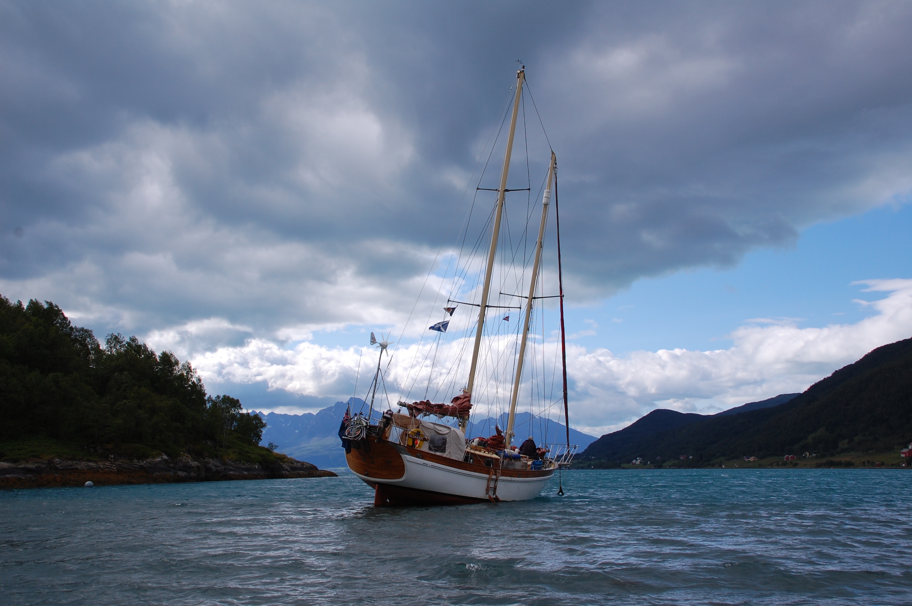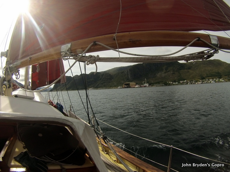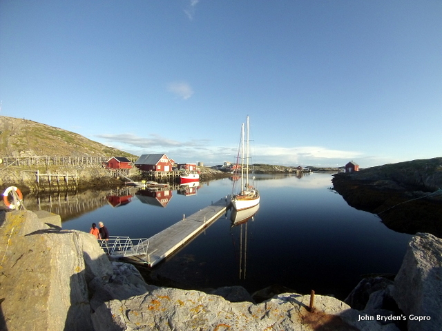 Next day, 20th, we were later getting going, 0800 to be exact, but had a terrific sail south in a N of W wind along Hustadvika, until 1800, when we anchored in Vaulen, Midøy, inside the relatively sheltered Harøyfjord, and north of Alesund. Today we had fast and exciting sailing with large waves, and covered about 63nm. On 21st we decided to sail to a harbour close to Stattlandet, some 30 miles. This was Fåsnavåg on Bergsøya, a delightful small, very sheltered harbour. There were many small one or two men fishing boats long lining for mackerel o the way in, and David discovered that one of them had delivered 4.5 tonnes of mackerel to the local ice plant that evening. We had also caught 4 nice ~Mackerel en route (actually 5, but one escaped!), which we had for supper as well as lunch the following day. The other adventure was that we were locked in a garage through which one had to pass to have a shower and visit the toilet. We eventually managed to alert a passer-by, who got the responsible person from the restaurant to let us out! On 22nd we set off early-ish (0700) for Statt in light winds, but approaching Statt headland the winds picked up nicely from the North, and again we had great sailing round the notorious headland and into Sildgapet, reaching Maløy by 1300.