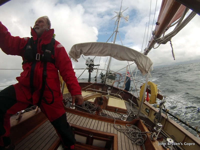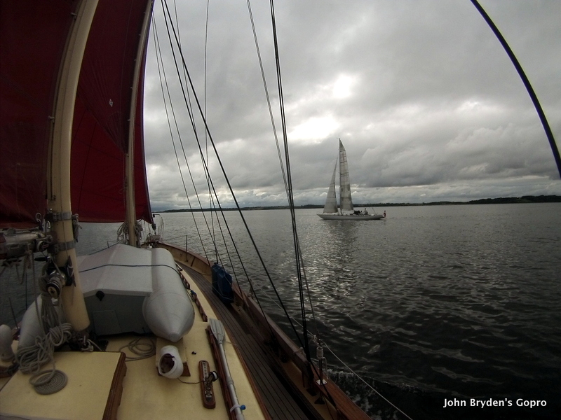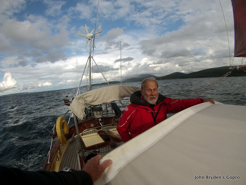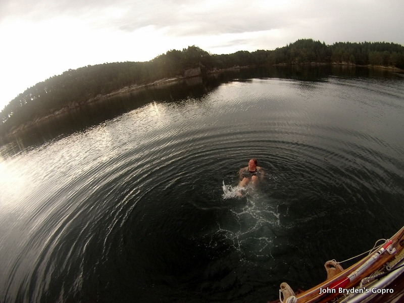Wednesday Move to the town quay before breakfast and collect repaired genoa from Stig’s workshop. Sail and motorsail to Dyroy anticipating thunderstorm that never happens. Exciting half hour approaching 18 metre bridge with 18 metre mast. Nice protected anchorage off Dyroy with church onshore. We re-lay the anchor in deeper water. Heavy showers for our short walk ashore. Lovely swim on our return to the boat.