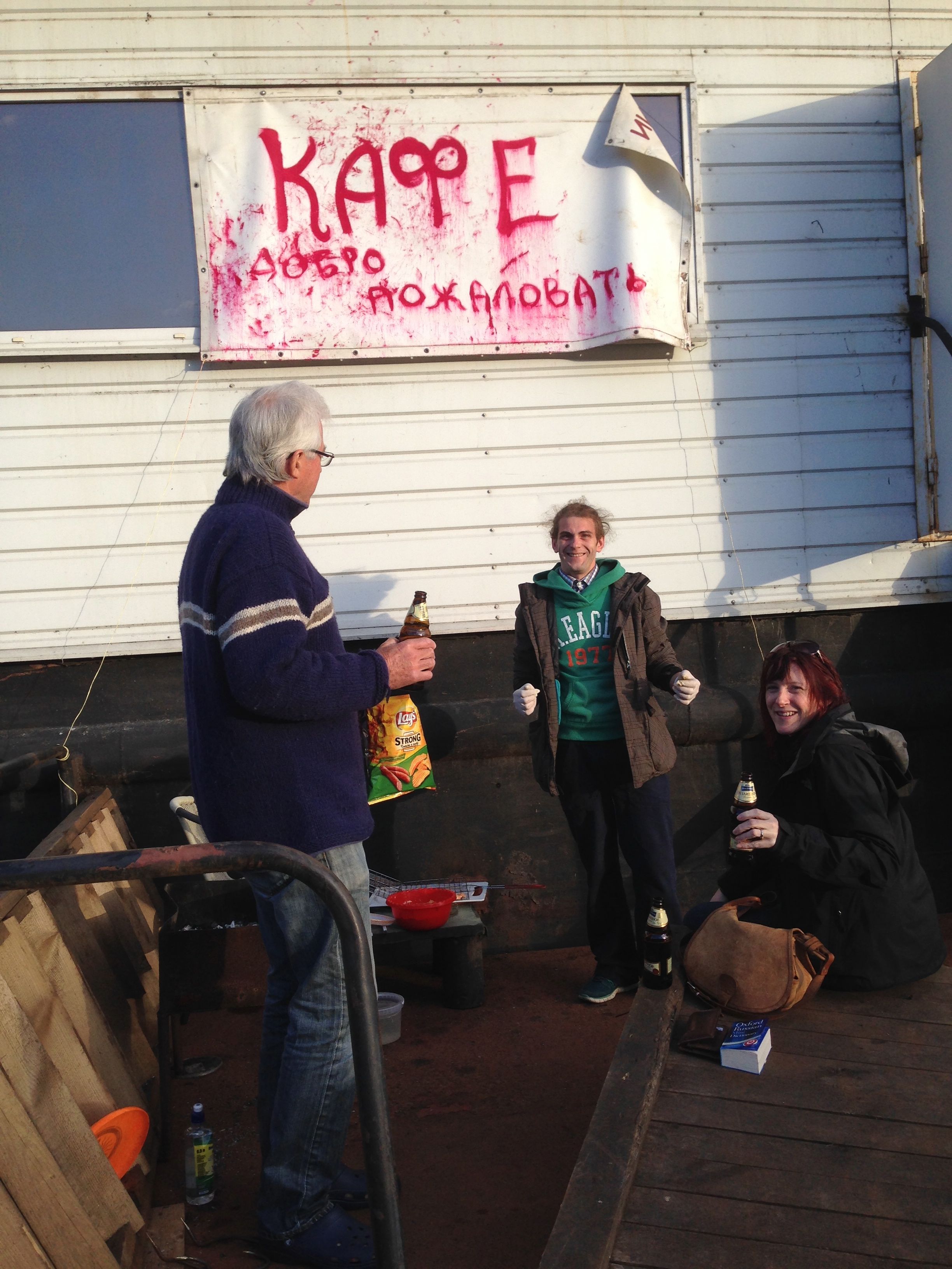 The old wooden building where Olga’s flat is. Olga Alasdair and John in the photo, taken by Cathel.