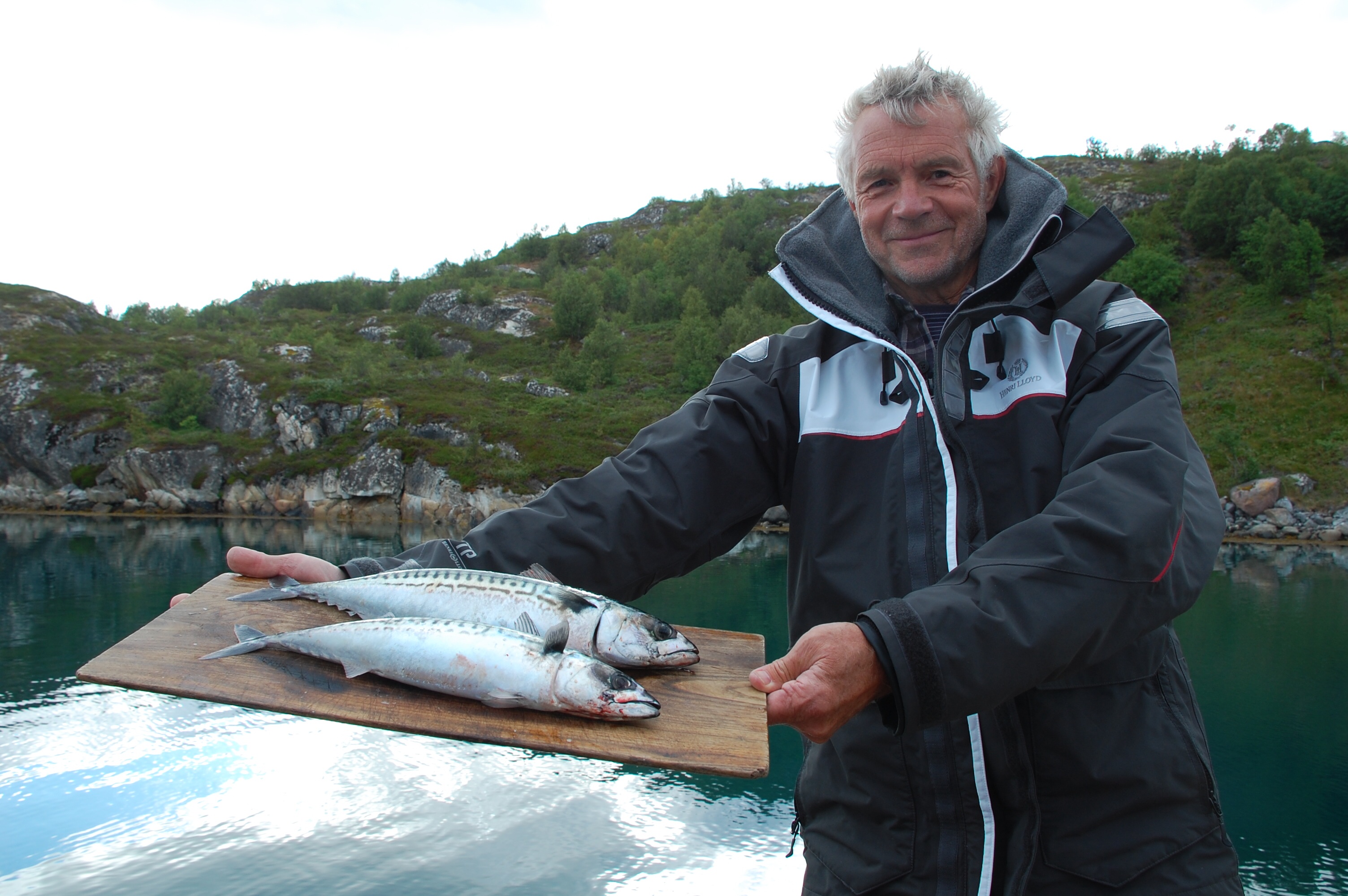 The next haven we reached on the following day was Skjernvoya. We had a really nice day sailing with an average speed of 6 knots or more and lots of waves from behind, giving us a real surfing feeling, really nice! John chose this particular wavy day to bake his wonderful cake and a new bread, both so delicious!! Later in the evening, in a shallower part with rocks, John told me to start fishing and I caught 5 Mackerel in less than 5 minutes; 2 escaped and we freed the smallest. Arriving at Skjernvoya, we thought nobody was living there but when I went out for a walk after dinner, I met someone! He told me he was working for the Marine Harvest Fish Farm, as well as doing some fishing in his own boat. It is just amazing to think people are actually living in this lonely place.